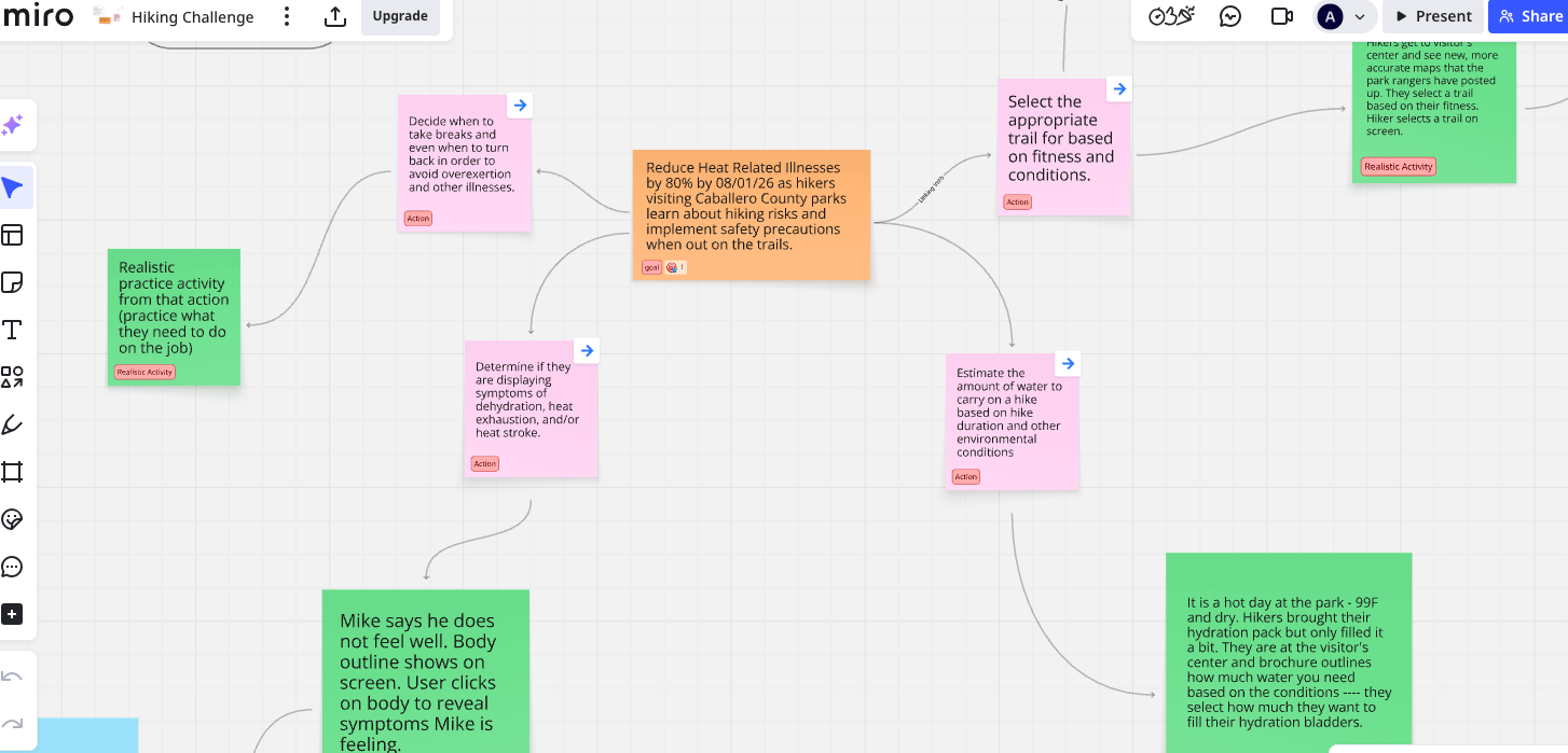 I started by creating an action map in Miro to define key goals and realistic decision points (trail choice, hydration, response to symptoms). I designed a narrative that branches based on learner decisions and illustrates real-life consequences.